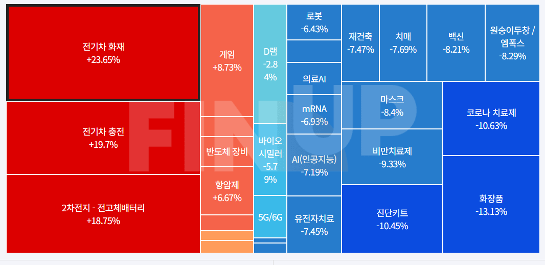 목차    당일 지수 및 종목등락, 테마맵 (MAP)     출처:Finup Theme Log  코스피 특징주※ 종목 명을 클릭하시면  기업개요, 종목 설명 및 실시간 주가를 확인하실 수 있습니다. 특징종목이슈