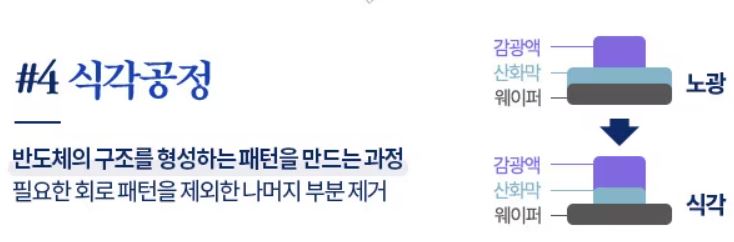 건식 식각(Dry Etching): 반응성 기체, 이온등을 이용해 제거, 습식보다 비싸고 까다롭지만 미세회로에 수율이 높음 습식 식각(Wet Etching): 용액을 이용 화학적인 반응으로 제거 파츠(Parts): 식각공정에서 사용되는 소모성부품 |