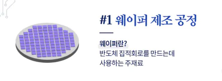 - 전공정 #1 웨이퍼제조 공정, #2산화 공정, #3포토 공정, # 4식각공정, #5 증착 공정, #6금속배선까지의 공정으로 웨이퍼를 가공하여 위에 회로를 그려 칩을 만드는 과정