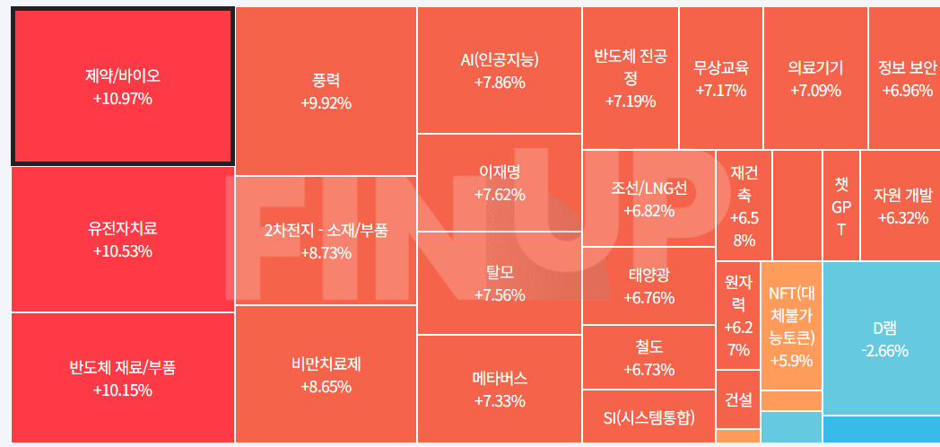목차 당일 지수 및 종목등락, 테마맵 (MAP) 출처:Finup Theme Log 코스피 특징주※ 종목 명을 클릭하시면 기업개요, 종목 설명 및 실시간 주가를 확인하실 수 있습니다. 특징종목이슈