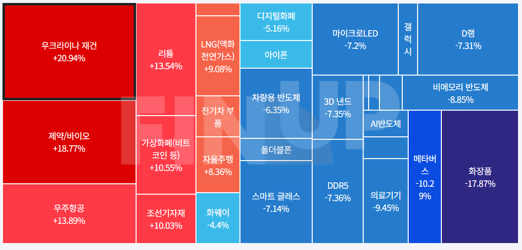 목차 당일 지수 및 종목등락, 테마맵 (MAP) 출처:Finup Theme Log 코스피 특징주※ 종목 명을 클릭하시면 기업개요, 종목 설명 및 실시간 주가를 확인하실 수 있습니다. 특징종목이슈요
