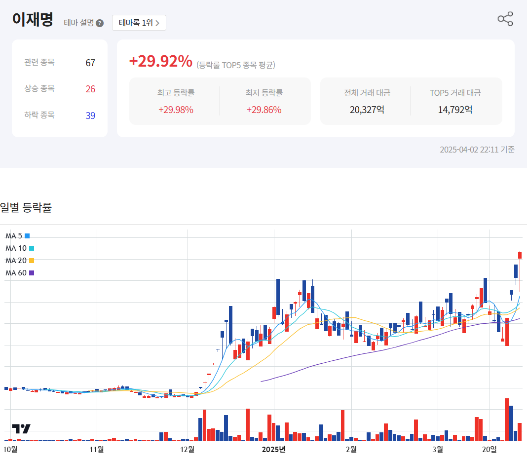 2025년 4월 2일 Finup 테마록 기준 이재명 테마주 종목별 등락