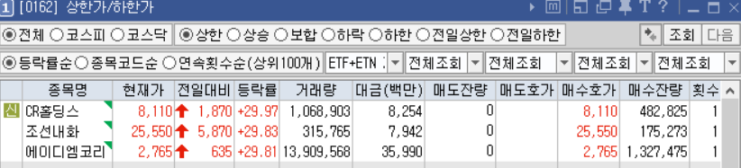 ▷이에 동사의 주가가 상한가를 기록중이며, 기존 조선내화의 내화물제조 사업부문이 인적 분할됨에 따라 변경 상장된 바 있는 CR홀딩스도 상한가를 기록중.