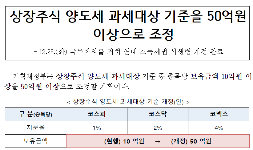 [속보] 상장주식 '대주주 양도세' 기준 10억→50억 상향