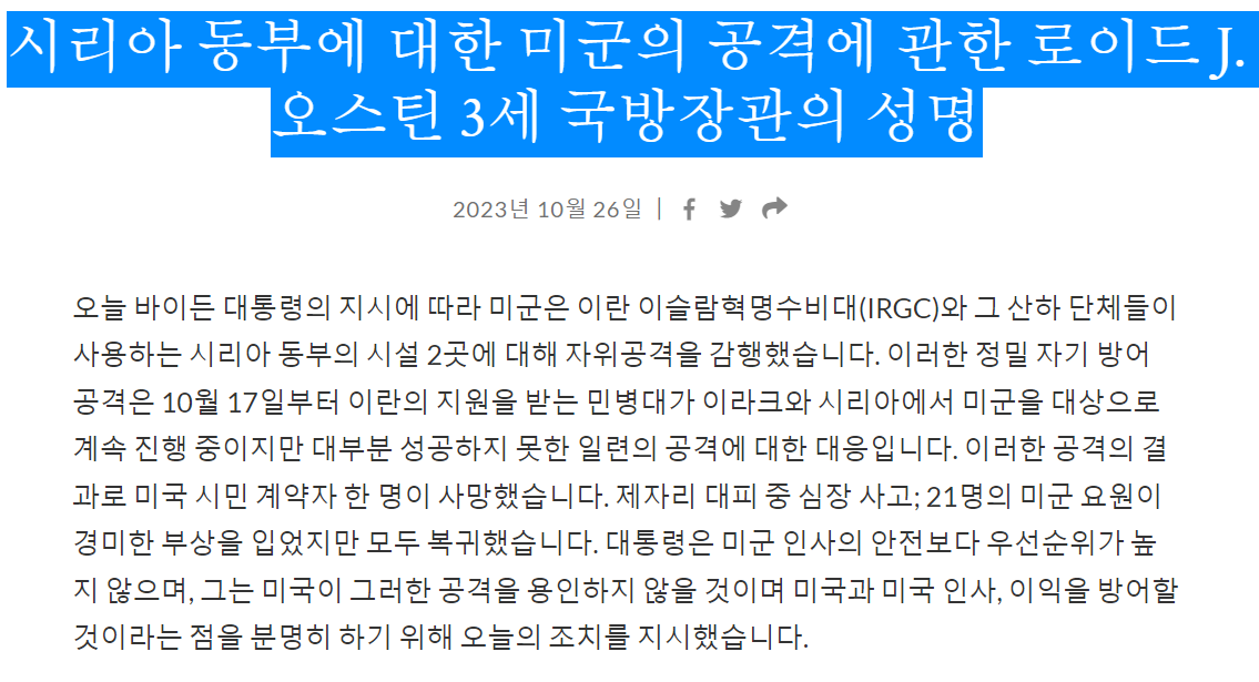(23.10.27) [속보] 美, 시리아내 이란 혁명수비대 시설 두곳 타격…바이든 명령