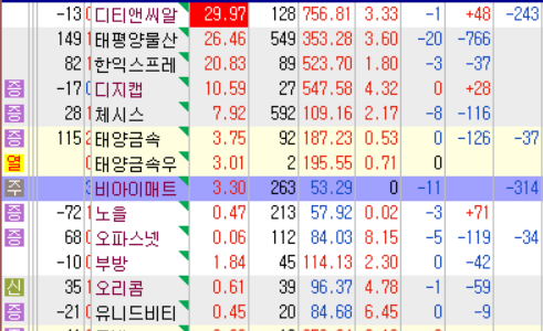 디티앤씨알, 태평양물산, 한익스프레스, KCC건설, 체시스, 노을, 오파스넷, 부방, 오리콤, 극동유화, 동양파일, 썸에이지, 유니드비티플러스, 금비, 삼화왕관, 토비스, 디지캡, 비씨엔씨, 태양금속, 유유제약, 비아이매트릭스