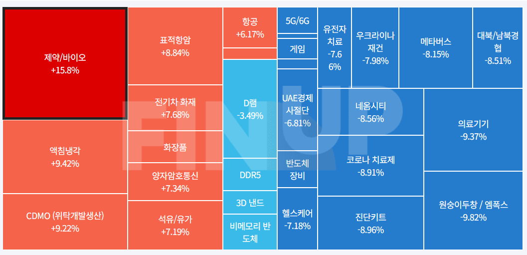 목차 당일 지수 및 종목등락, 테마맵 (MAP) 출처:Finup Theme Log 코스피 특징주※ 종목 명을 클릭하시면 기업개요, 종목 설명 및 실시간 주가를 확인하실 수 있습니다. 특징종목이슈
